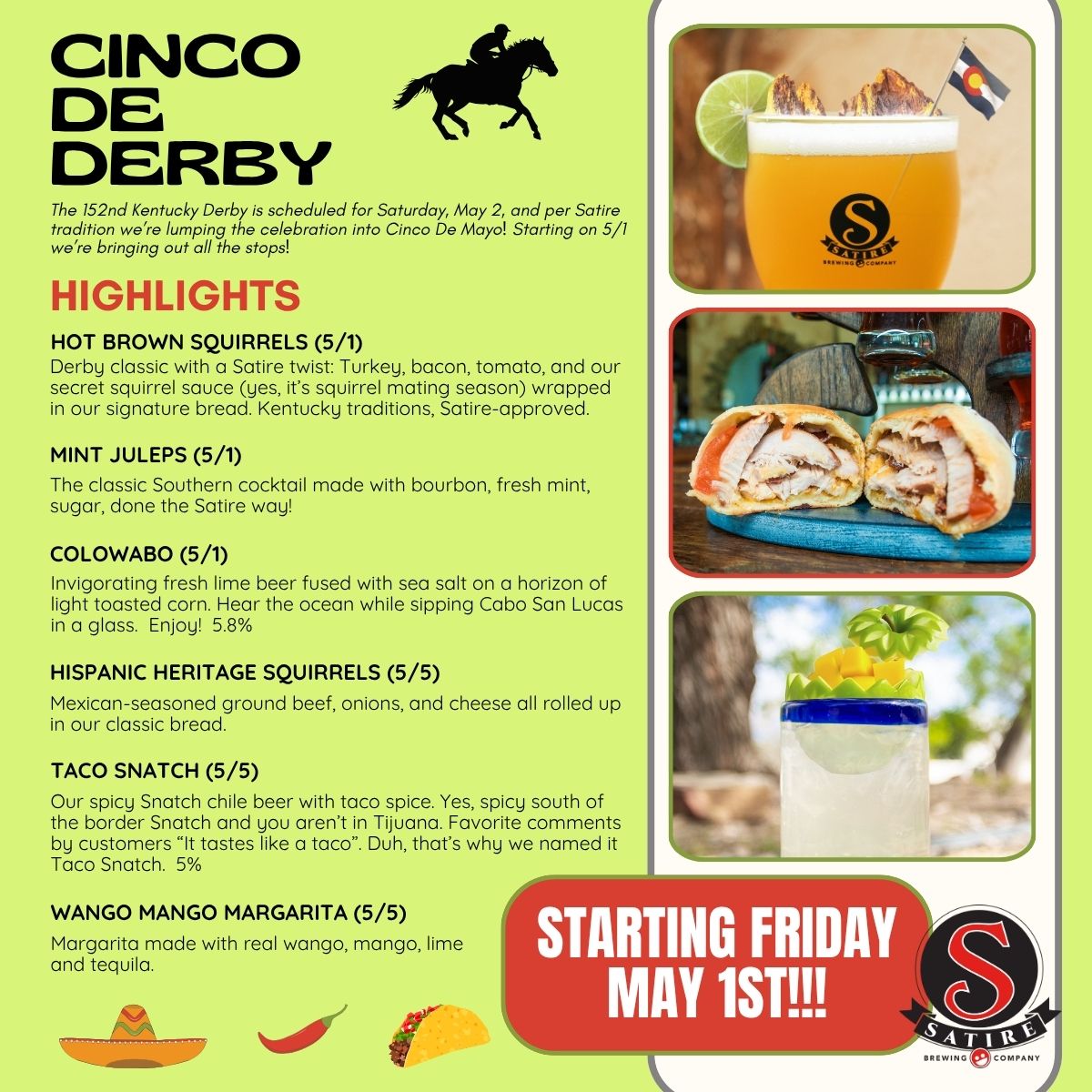 We START FROM SCRATCH on Friday as we open up at noon and have our Satire rendition of the classic derby drink Mint Julep with Kentucky bourbon, fresh mint and Satire simple syrup on ice. Our esteemed chef will give you a RUN FOR YOUR MONEY with our version of a Hot Brown, The Hot Brown Squirrel, thick sliced turkey, bacon, cheese, tomato, secret cream sauce wrapped in our amazing bread. Limited time only!